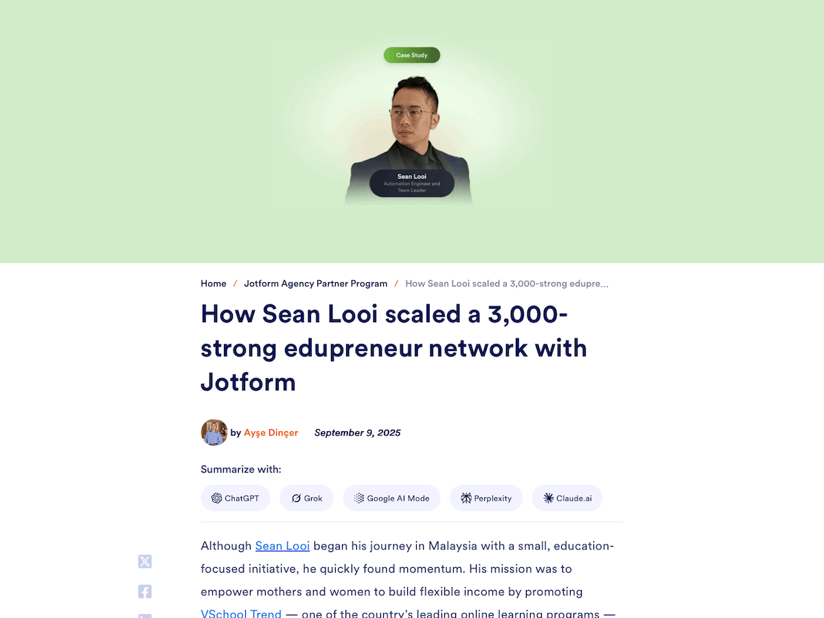Featured in Jotform’s official blog for building an automated backend that scaled a 3,000-strong edupreneur network. The article highlights Sean Looi’s use of over 80 workflows to streamline onboarding, lead generation, and team coaching.